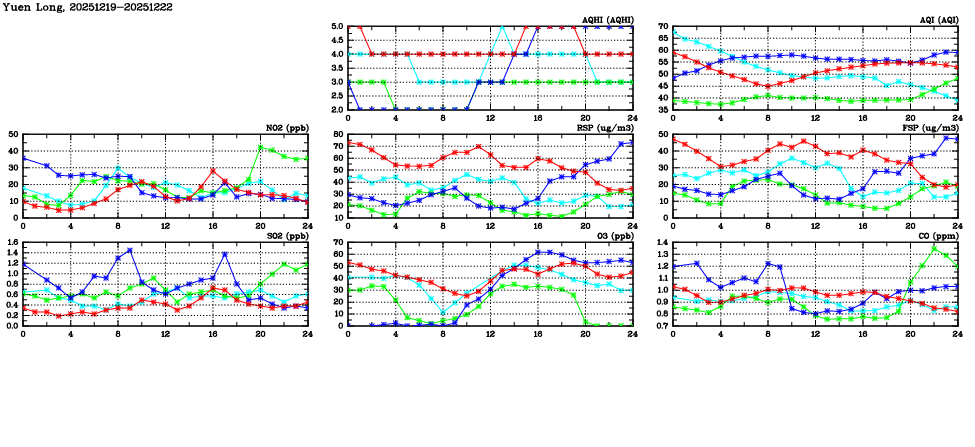 | Air Quality Data Time Series in Yuen Long (2025/12/22) | ( Line colors: Day -3 Day -2 Day -1 Current day ) | 2D Map Current AQHI |