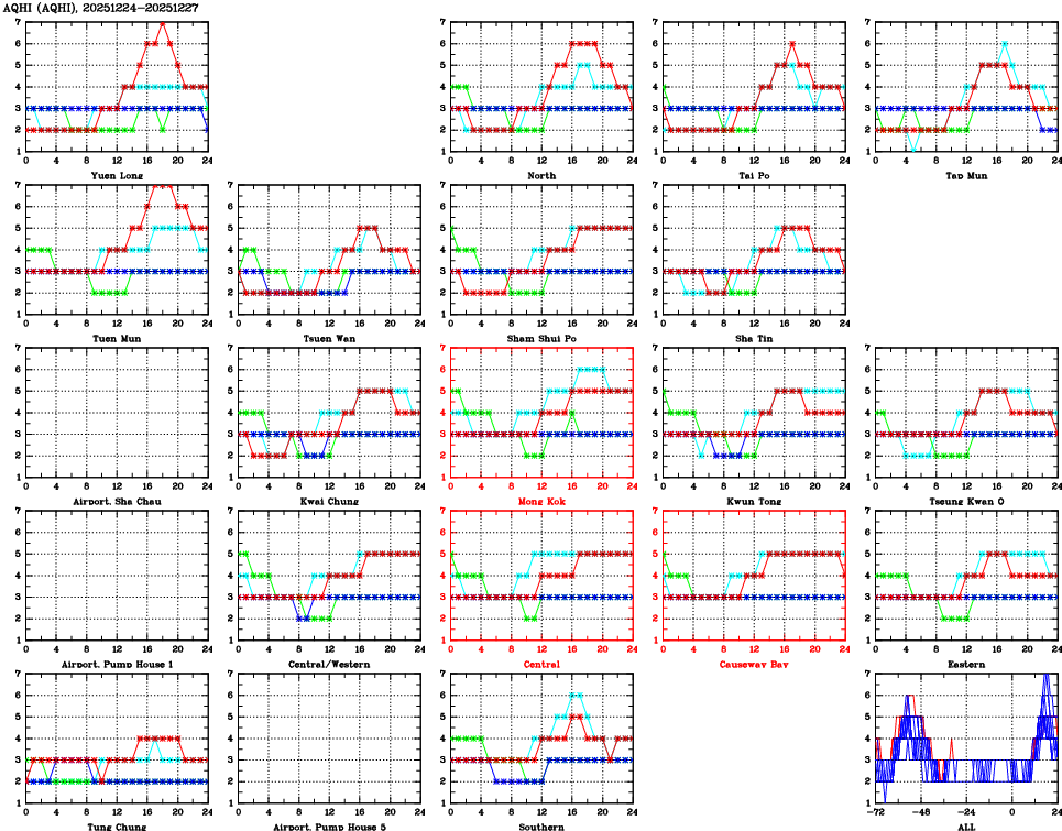 | Air Quality Data Time Series for AQHI (2025/12/27) | ( Line colors: Day -3 Day -2 Day -1 Current day ) | 2D Map Current AQHI |