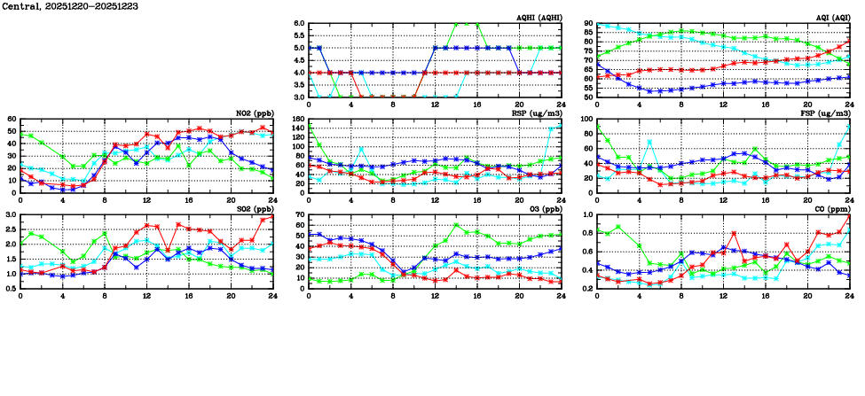 | Air Quality Data Time Series in Central (2025/12/23) | ( Line colors: Day -3 Day -2 Day -1 Current day ) | 2D Map Current AQHI |