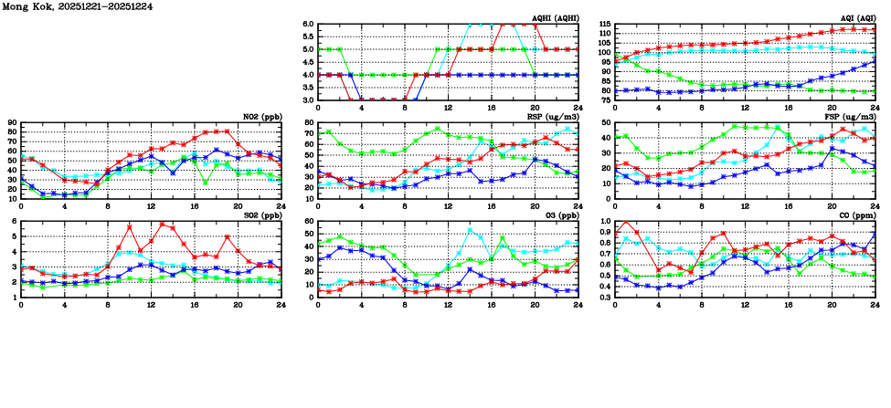 | Air Quality Data Time Series in Mong Kok (2025/12/24) | ( Line colors: Day -3 Day -2 Day -1 Current day ) | 2D Map Current AQHI |