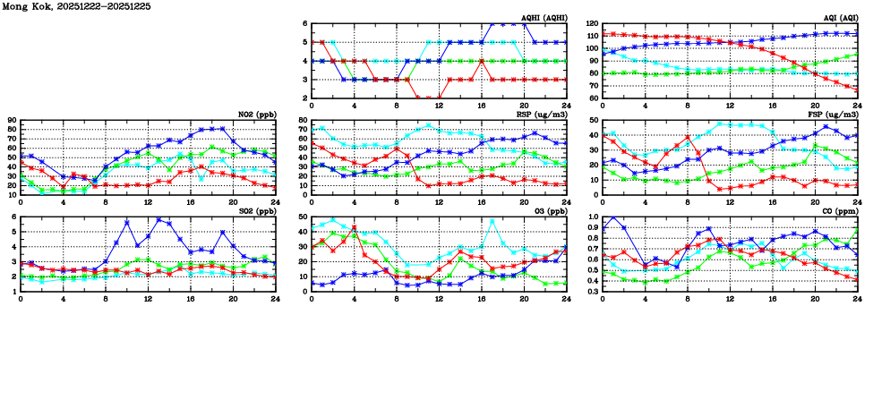 | Air Quality Data Time Series in Mong Kok (2025/12/25) | ( Line colors: Day -3 Day -2 Day -1 Current day ) | 2D Map Current AQHI |