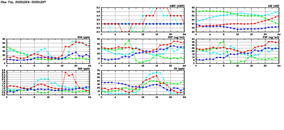 | Air Quality Data Time Series in Sha Tin (2025/12/27) | ( Line colors: Day -3 Day -2 Day -1 Current day ) | 2D Map Current AQHI |