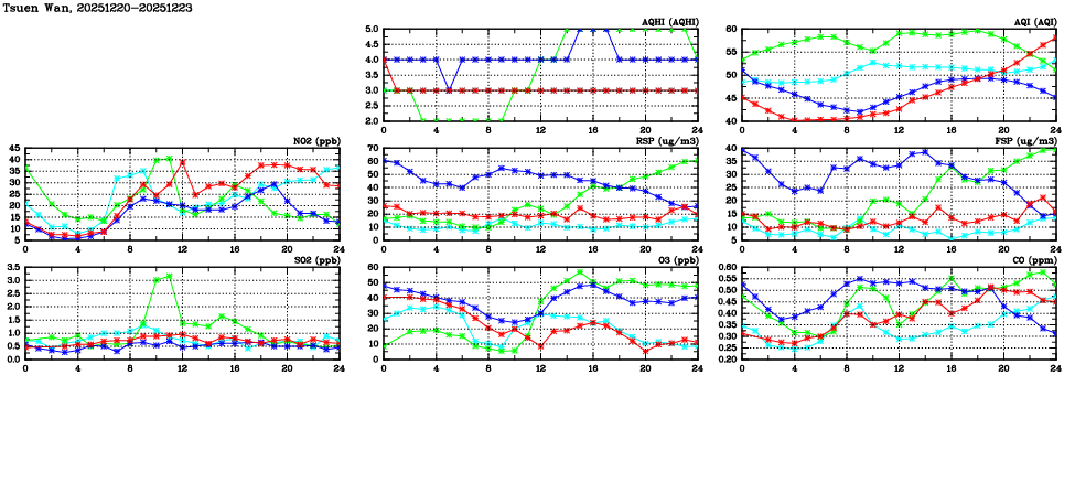 | Air Quality Data Time Series in Tsuen Wan (2025/12/23) | ( Line colors: Day -3 Day -2 Day -1 Current day ) | 2D Map Current AQHI |