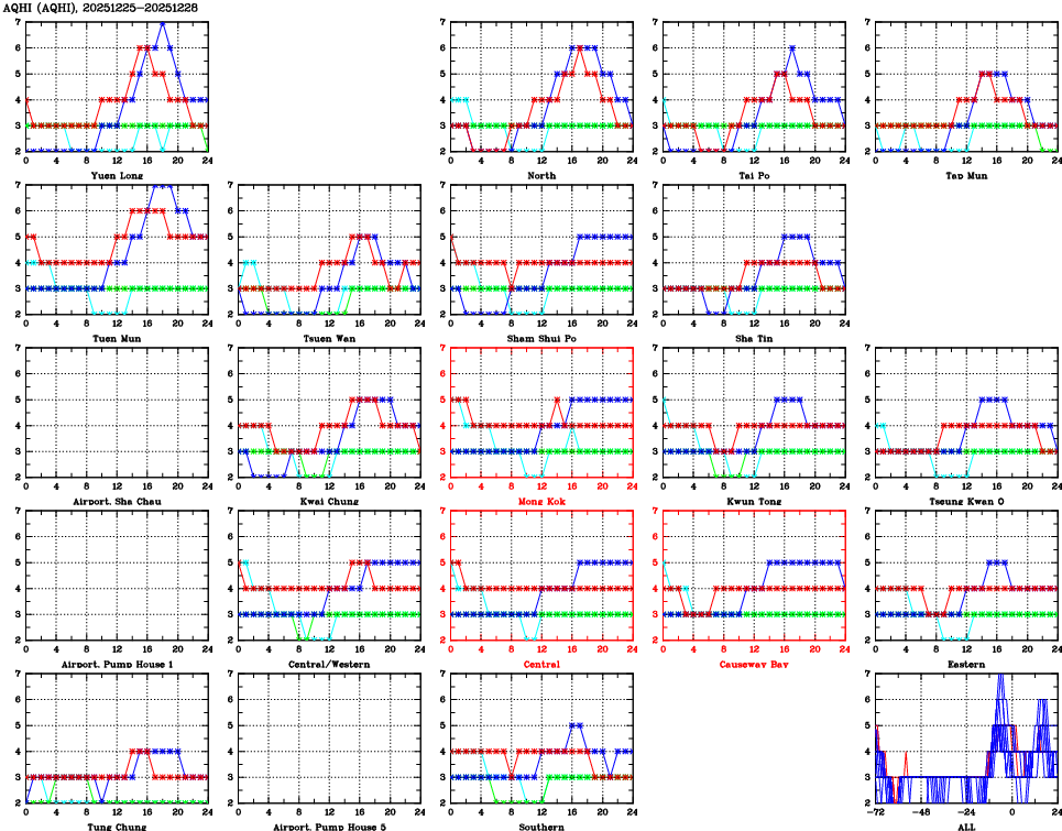 | Air Quality Data Time Series for AQHI (2025/12/28) | ( Line colors: Day -3 Day -2 Day -1 Current day ) | 2D Map Current AQHI |