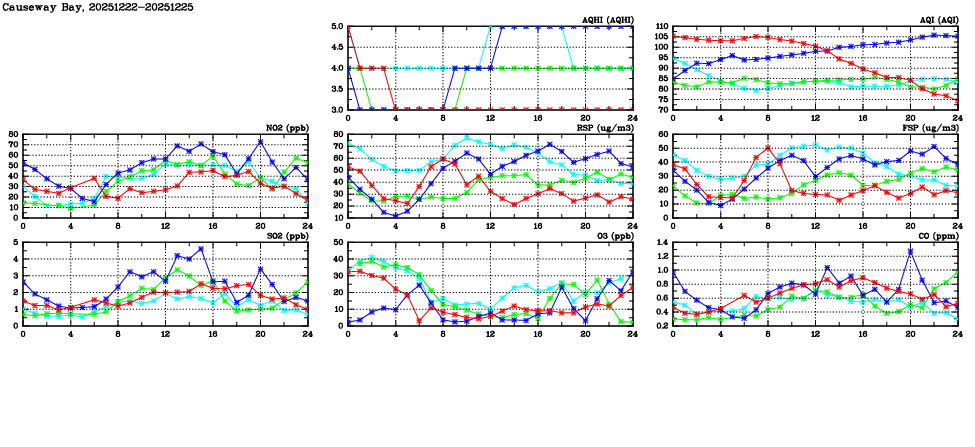 | Air Quality Data Time Series in Causeway Bay (2025/12/25) | ( Line colors: Day -3 Day -2 Day -1 Current day ) | 2D Map Current AQHI |
