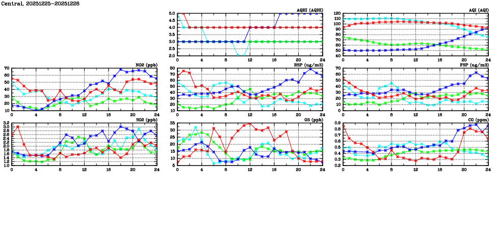 | Air Quality Data Time Series in Central (2025/12/28) | ( Line colors: Day -3 Day -2 Day -1 Current day ) | 2D Map Current AQHI |