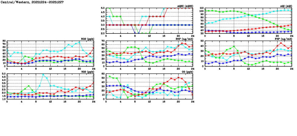 | Air Quality Data Time Series in Central/Western (2025/12/27) | ( Line colors: Day -3 Day -2 Day -1 Current day ) | 2D Map Current AQHI |