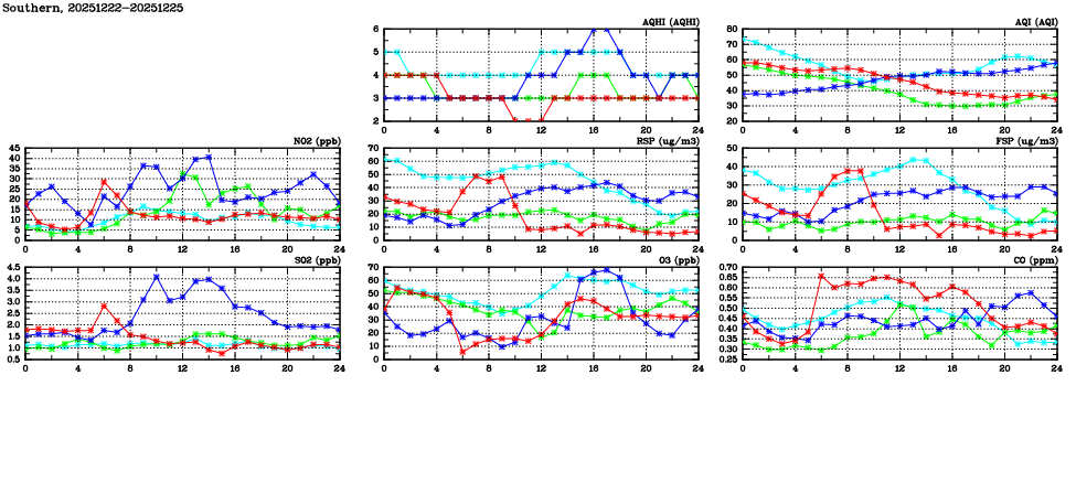 | Air Quality Data Time Series in Southern (2025/12/25) | ( Line colors: Day -3 Day -2 Day -1 Current day ) | 2D Map Current AQHI |