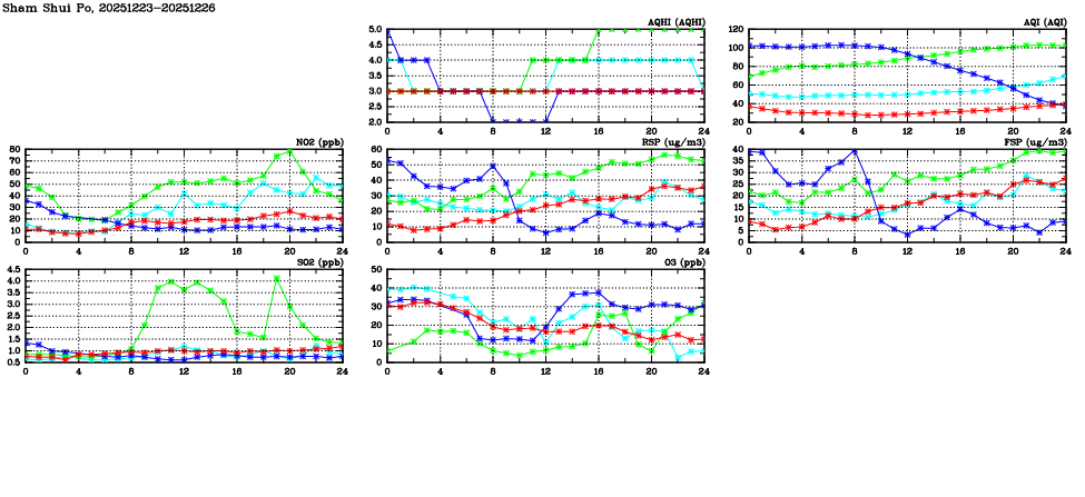 | Air Quality Data Time Series in Sham Shui Po (2025/12/26) | ( Line colors: Day -3 Day -2 Day -1 Current day ) | 2D Map Current AQHI |
