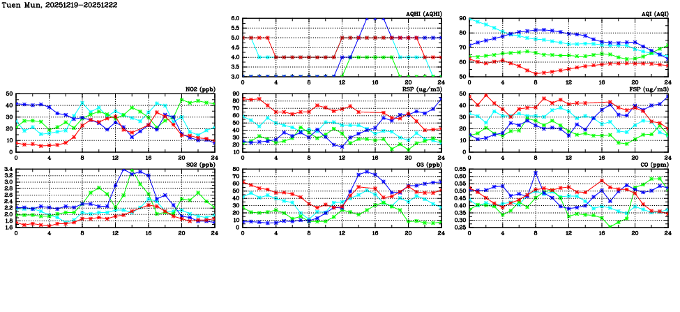 | Air Quality Data Time Series in Tuen Mun (2025/12/22) | ( Line colors: Day -3 Day -2 Day -1 Current day ) | 2D Map Current AQHI |