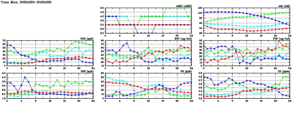 | Air Quality Data Time Series in Tuen Mun (2025/12/26) | ( Line colors: Day -3 Day -2 Day -1 Current day ) | 2D Map Current AQHI |