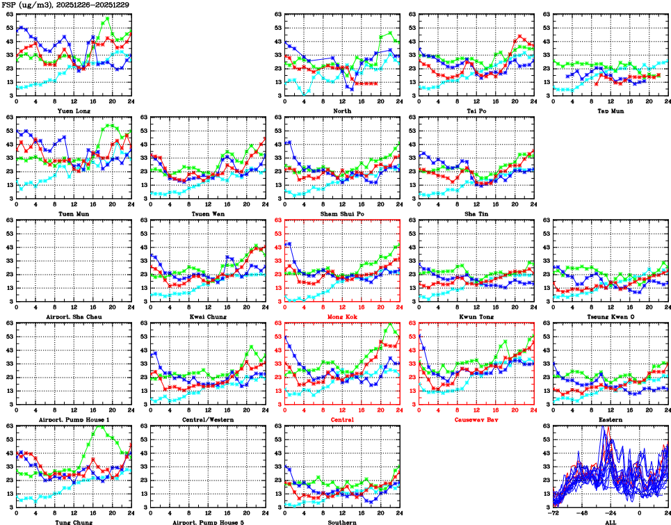 | Air Quality Data Time Series for FSP (2025/12/29) | ( Line colors: Day -3 Day -2 Day -1 Current day ) | 2D Map Current AQHI |