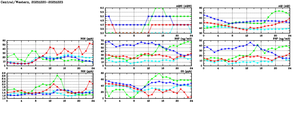| Air Quality Data Time Series in Central/Western (2025/12/23) | ( Line colors: Day -3 Day -2 Day -1 Current day ) | 2D Map Current AQHI |