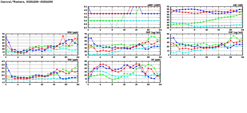 | Air Quality Data Time Series in Central/Western (2025/12/29) | ( Line colors: Day -3 Day -2 Day -1 Current day ) | 2D Map Current AQHI |