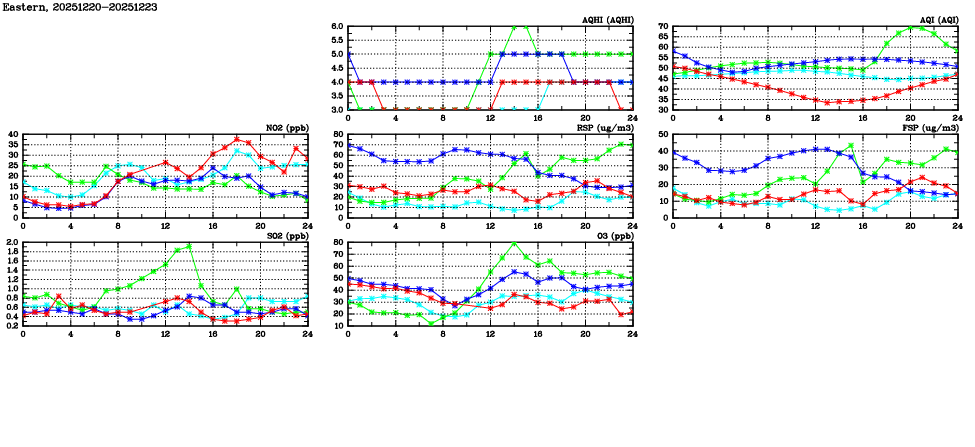 | Air Quality Data Time Series in Eastern (2025/12/23) | ( Line colors: Day -3 Day -2 Day -1 Current day ) | 2D Map Current AQHI |