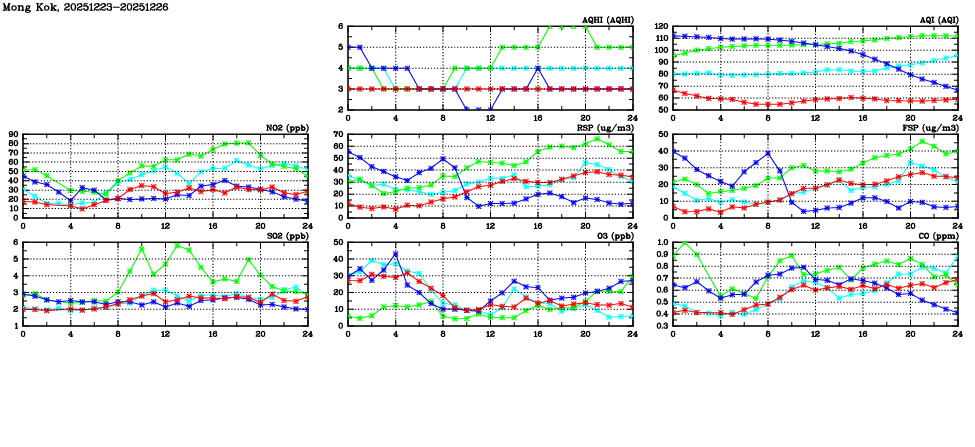 | Air Quality Data Time Series in Mong Kok (2025/12/26) | ( Line colors: Day -3 Day -2 Day -1 Current day ) | 2D Map Current AQHI |