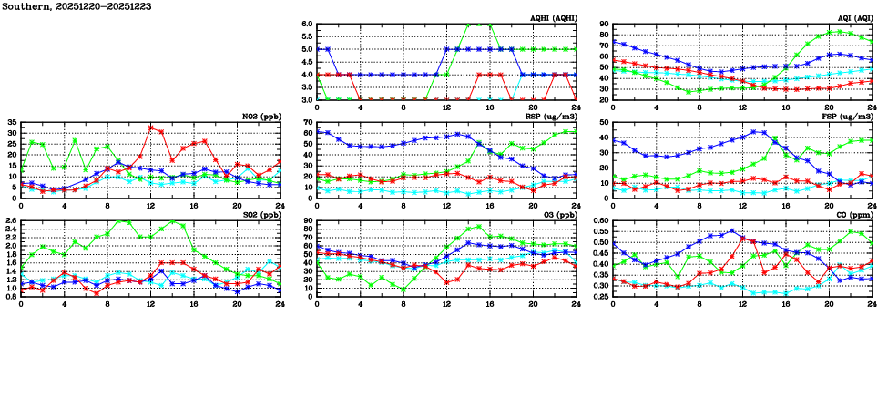 | Air Quality Data Time Series in Southern (2025/12/23) | ( Line colors: Day -3 Day -2 Day -1 Current day ) | 2D Map Current AQHI |