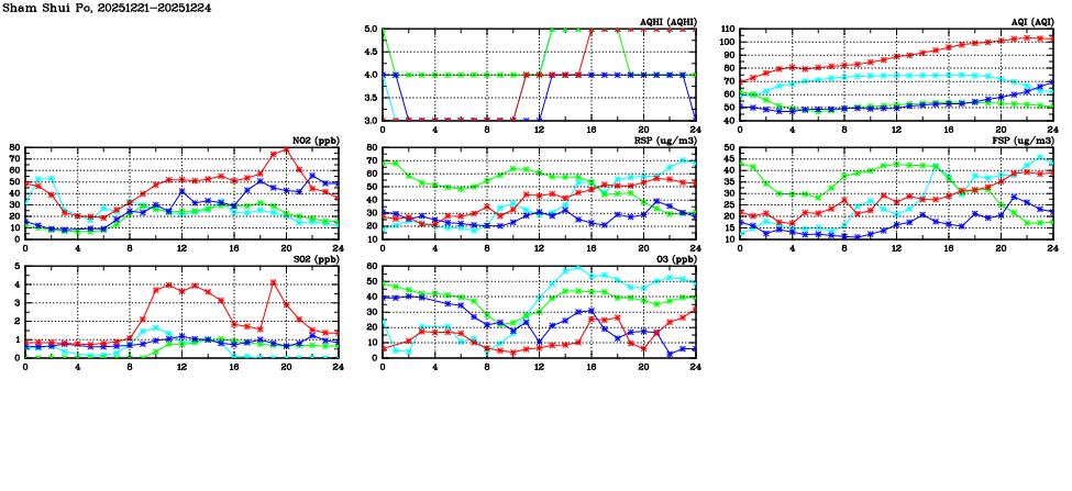 | Air Quality Data Time Series in Sham Shui Po (2025/12/24) | ( Line colors: Day -3 Day -2 Day -1 Current day ) | 2D Map Current AQHI |