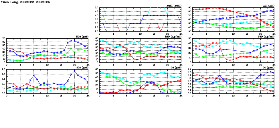 | Air Quality Data Time Series in Yuen Long (2025/12/25) | ( Line colors: Day -3 Day -2 Day -1 Current day ) | 2D Map Current AQHI |