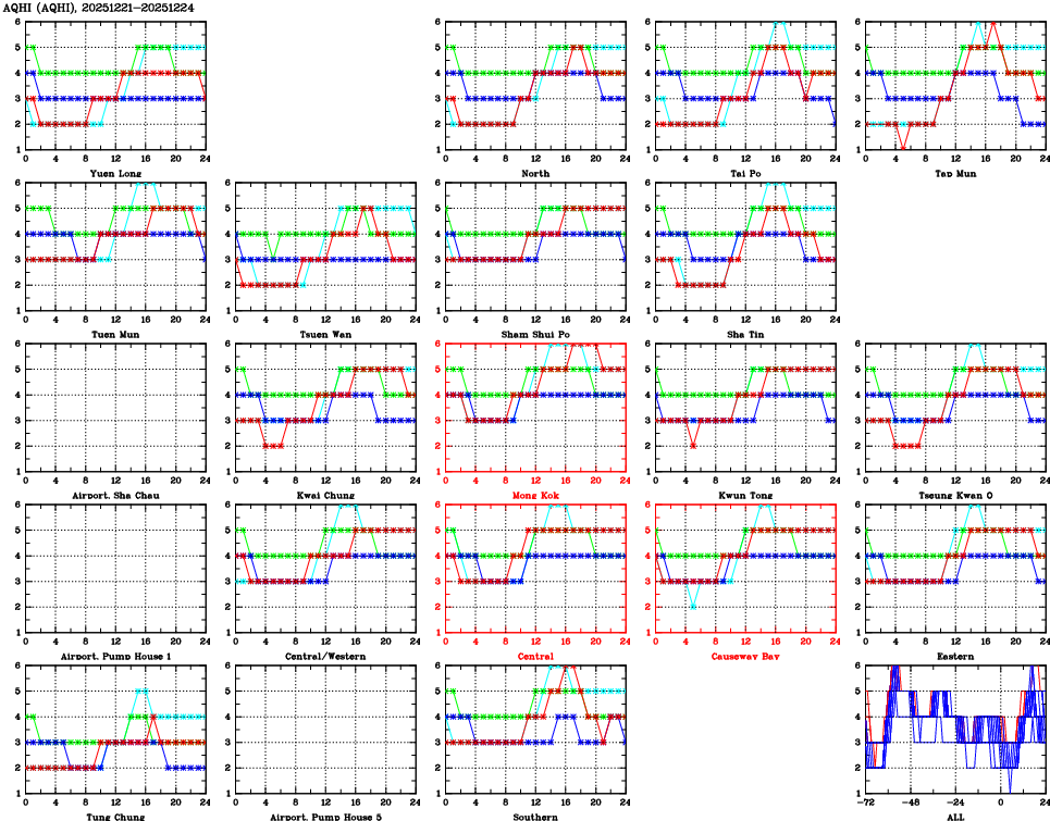 | Air Quality Data Time Series for AQHI (2025/12/24) | ( Line colors: Day -3 Day -2 Day -1 Current day ) | 2D Map Current AQHI |