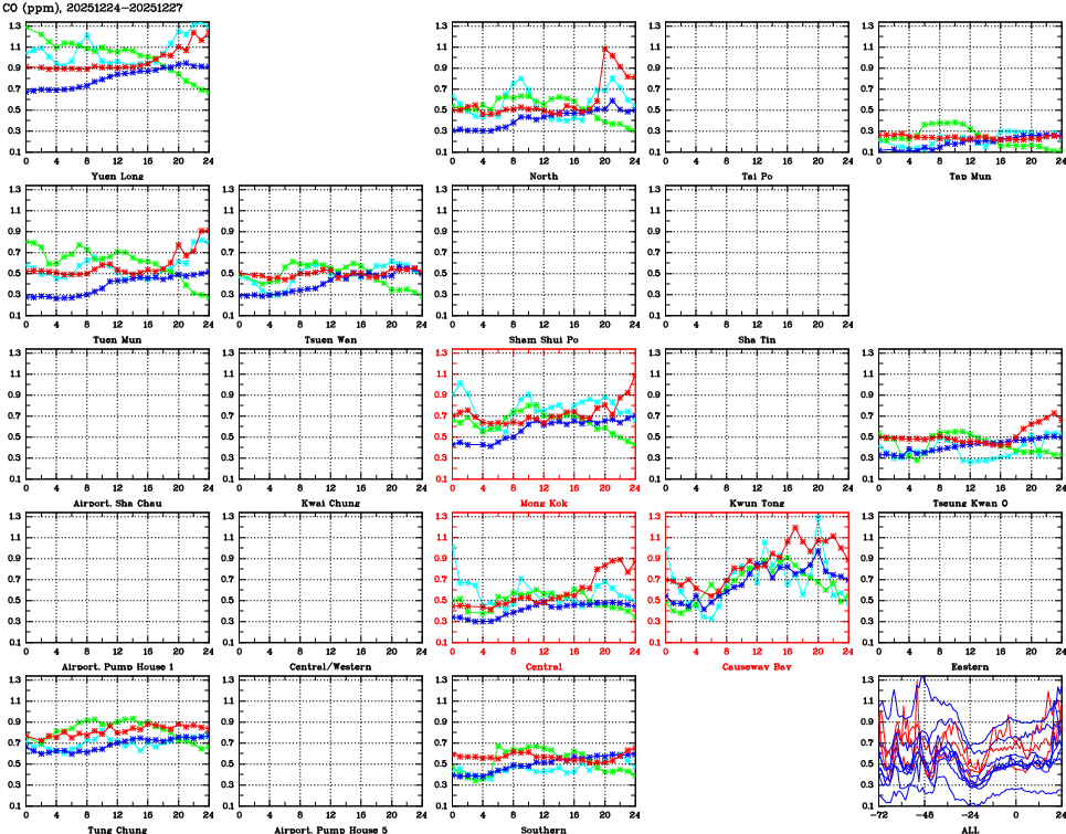 | Air Quality Data Time Series for CO (2025/12/27) | ( Line colors: Day -3 Day -2 Day -1 Current day ) | 2D Map Current AQHI |