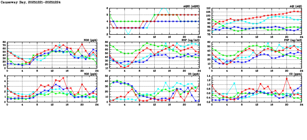 | Air Quality Data Time Series in Causeway Bay (2025/12/24) | ( Line colors: Day -3 Day -2 Day -1 Current day ) | 2D Map Current AQHI |