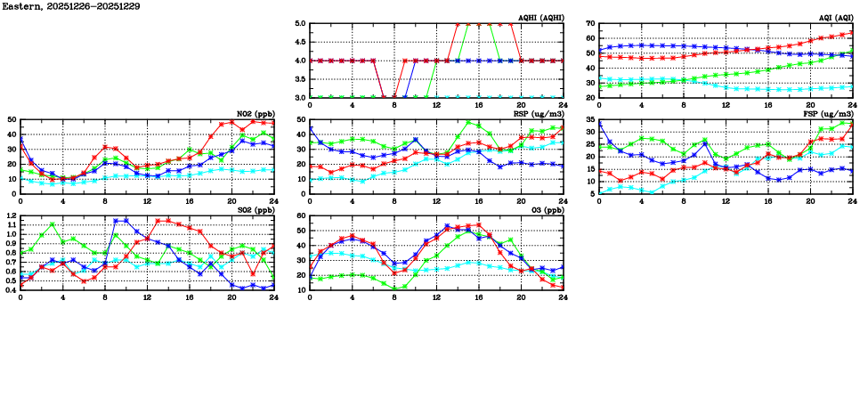 | Air Quality Data Time Series in Eastern (2025/12/29) | ( Line colors: Day -3 Day -2 Day -1 Current day ) | 2D Map Current AQHI |