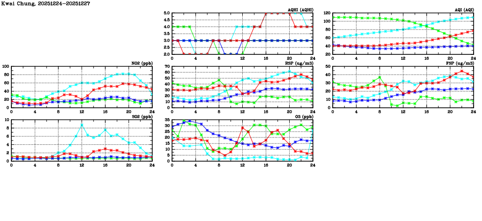 | Air Quality Data Time Series in Kwai Chung (2025/12/27) | ( Line colors: Day -3 Day -2 Day -1 Current day ) | 2D Map Current AQHI |