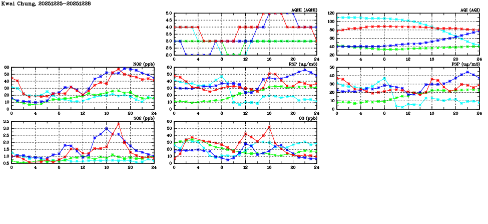 | Air Quality Data Time Series in Kwai Chung (2025/12/28) | ( Line colors: Day -3 Day -2 Day -1 Current day ) | 2D Map Current AQHI |