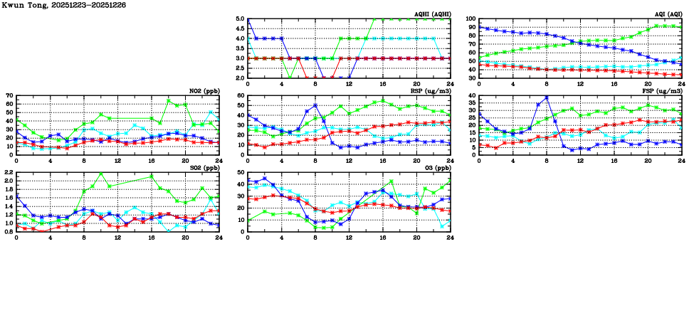 | Air Quality Data Time Series in Kwun Tong (2025/12/26) | ( Line colors: Day -3 Day -2 Day -1 Current day ) | 2D Map Current AQHI |