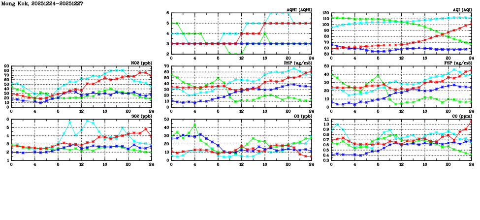 | Air Quality Data Time Series in Mong Kok (2025/12/27) | ( Line colors: Day -3 Day -2 Day -1 Current day ) | 2D Map Current AQHI |