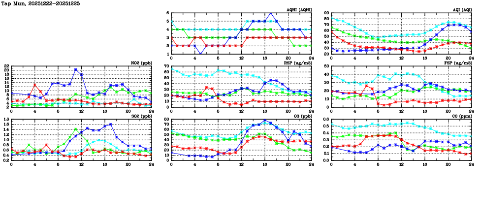 | Air Quality Data Time Series in Tap Mun (2025/12/25) | ( Line colors: Day -3 Day -2 Day -1 Current day ) | 2D Map Current AQHI |