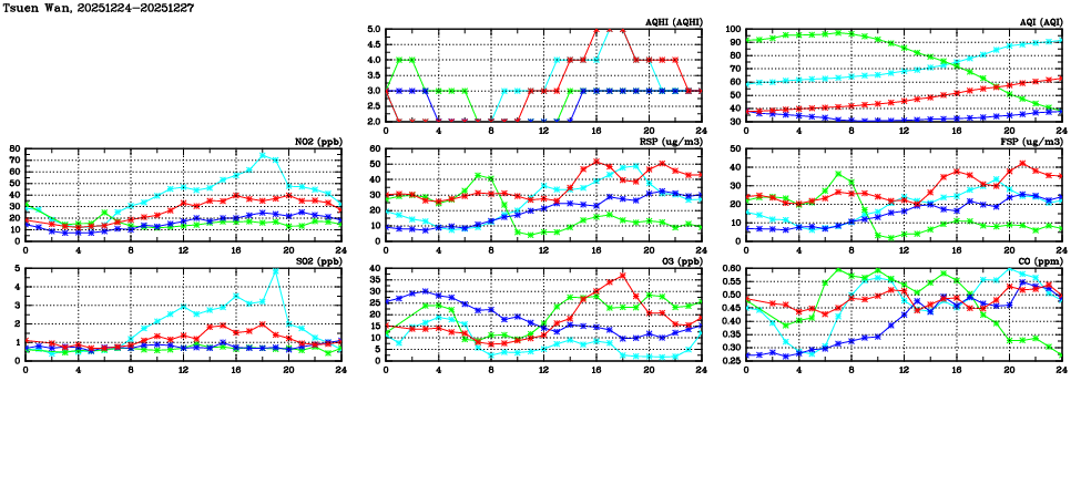 | Air Quality Data Time Series in Tsuen Wan (2025/12/27) | ( Line colors: Day -3 Day -2 Day -1 Current day ) | 2D Map Current AQHI |