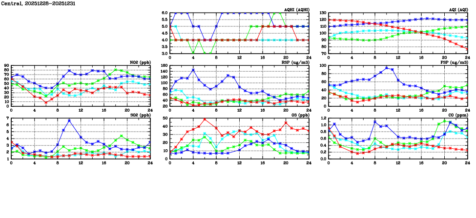 | Air Quality Data Time Series in Central (2025/12/31) | ( Line colors: Day -3 Day -2 Day -1 Current day ) | 2D Map Current AQHI |