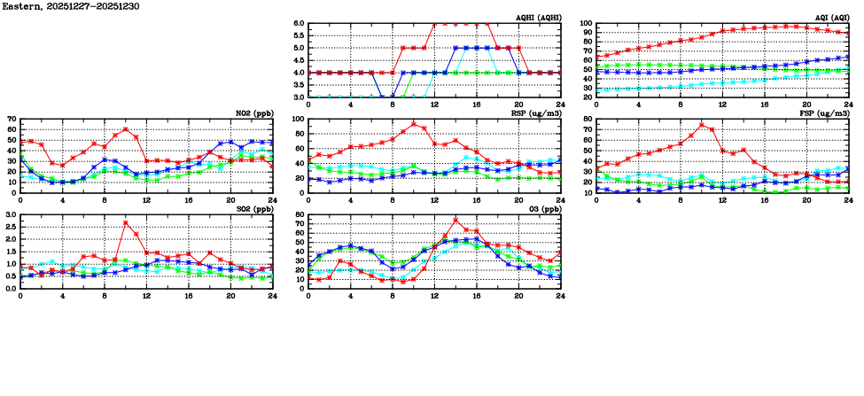 | Air Quality Data Time Series in Eastern (2025/12/30) | ( Line colors: Day -3 Day -2 Day -1 Current day ) | 2D Map Current AQHI |