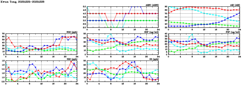 | Air Quality Data Time Series in Kwun Tong (2025/12/28) | ( Line colors: Day -3 Day -2 Day -1 Current day ) | 2D Map Current AQHI |