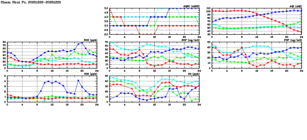 | Air Quality Data Time Series in Sham Shui Po (2025/12/25) | ( Line colors: Day -3 Day -2 Day -1 Current day ) | 2D Map Current AQHI |