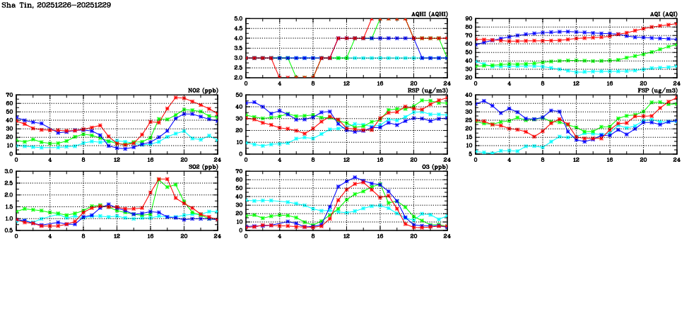| Air Quality Data Time Series in Sha Tin (2025/12/29) | ( Line colors: Day -3 Day -2 Day -1 Current day ) | 2D Map Current AQHI |
