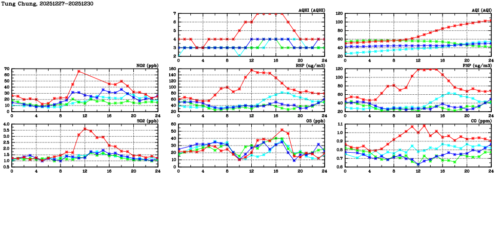 | Air Quality Data Time Series in Tung Chung (2025/12/30) | ( Line colors: Day -3 Day -2 Day -1 Current day ) | 2D Map Current AQHI |
