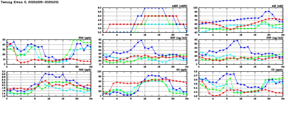| Air Quality Data Time Series in Tseung Kwan O (2025/12/31) | ( Line colors: Day -3 Day -2 Day -1 Current day ) | 2D Map Current AQHI |