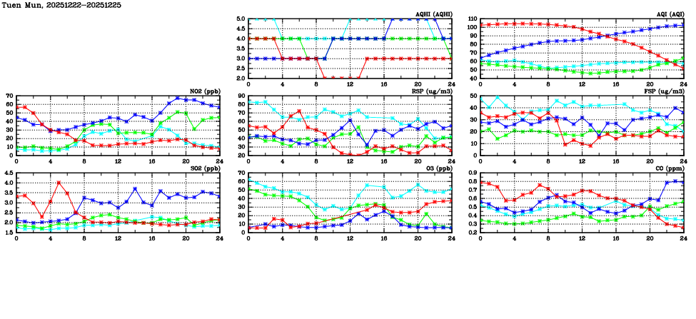 | Air Quality Data Time Series in Tuen Mun (2025/12/25) | ( Line colors: Day -3 Day -2 Day -1 Current day ) | 2D Map Current AQHI |