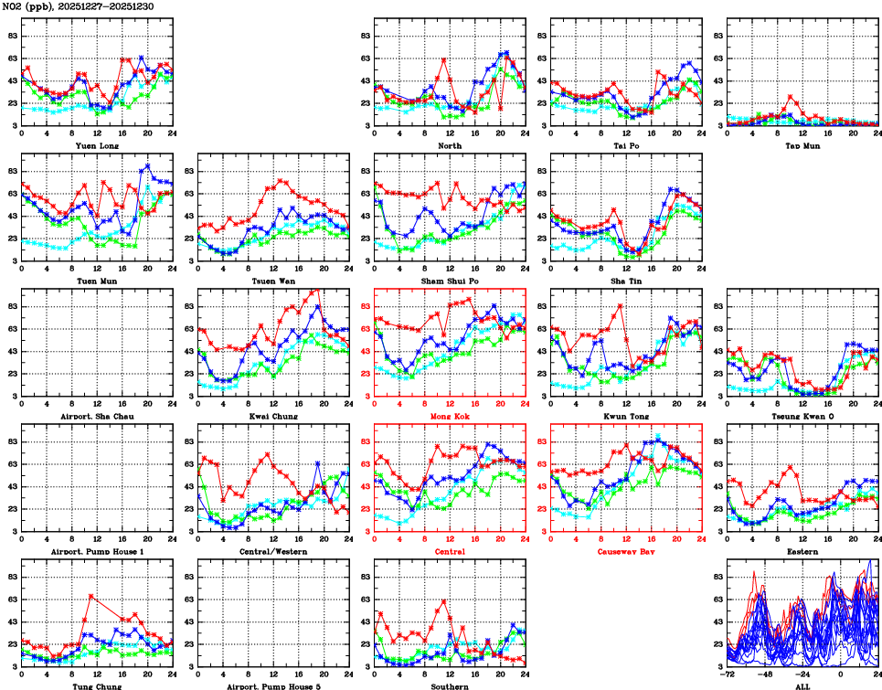 | Air Quality Data Time Series for NO2 (2025/12/30) | ( Line colors: Day -3 Day -2 Day -1 Current day ) | 2D Map Current AQHI |