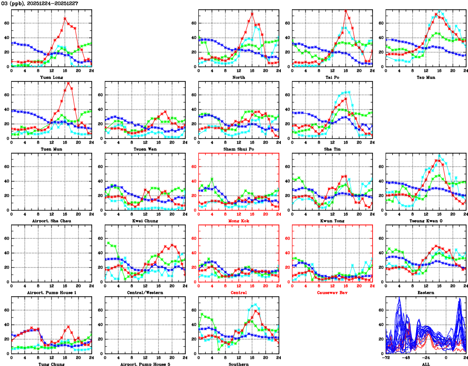 | Air Quality Data Time Series for O3 (2025/12/27) | ( Line colors: Day -3 Day -2 Day -1 Current day ) | 2D Map Current AQHI |