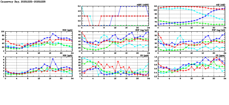 | Air Quality Data Time Series in Causeway Bay (2025/12/28) | ( Line colors: Day -3 Day -2 Day -1 Current day ) | 2D Map Current AQHI |