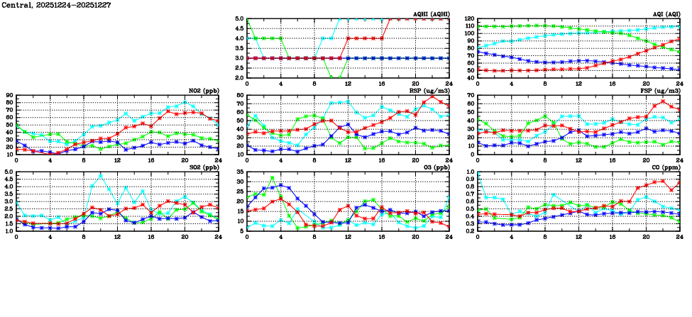 | Air Quality Data Time Series in Central (2025/12/27) | ( Line colors: Day -3 Day -2 Day -1 Current day ) | 2D Map Current AQHI |