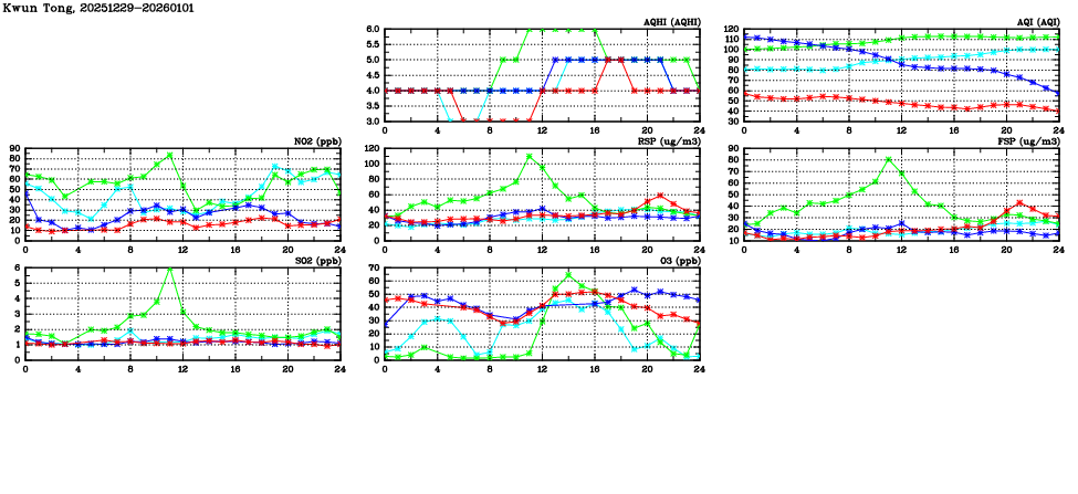 | Air Quality Data Time Series in Kwun Tong (2026/01/01) | ( Line colors: Day -3 Day -2 Day -1 Current day ) | 2D Map Current AQHI |