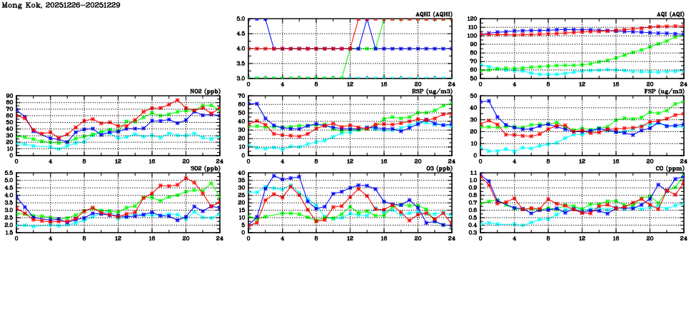 | Air Quality Data Time Series in Mong Kok (2025/12/29) | ( Line colors: Day -3 Day -2 Day -1 Current day ) | 2D Map Current AQHI |