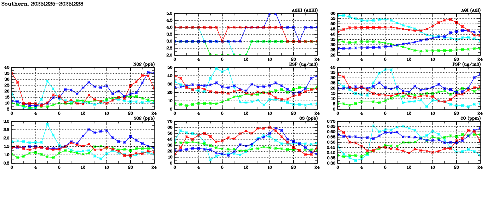 | Air Quality Data Time Series in Southern (2025/12/28) | ( Line colors: Day -3 Day -2 Day -1 Current day ) | 2D Map Current AQHI |
