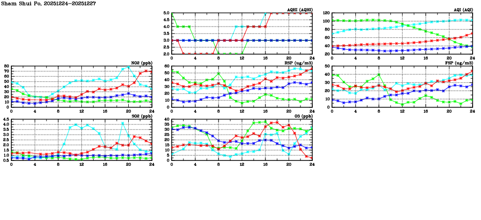 | Air Quality Data Time Series in Sham Shui Po (2025/12/27) | ( Line colors: Day -3 Day -2 Day -1 Current day ) | 2D Map Current AQHI |