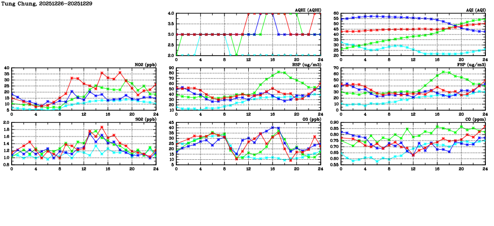 | Air Quality Data Time Series in Tung Chung (2025/12/29) | ( Line colors: Day -3 Day -2 Day -1 Current day ) | 2D Map Current AQHI |